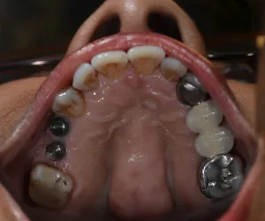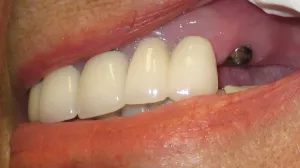 I am very happy with the cosmetic results. Her implant teeth blend so naturally with the other teeth, except for the red gingiva on #7 caused by an old poor fitting crown. The picture was taken at her one-week followup, the best I can do is a picture of her working cast on which the crowns were made since I did not have my camera on the day of cement.