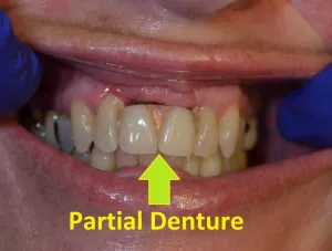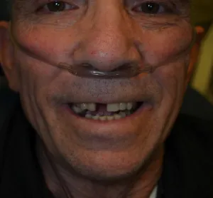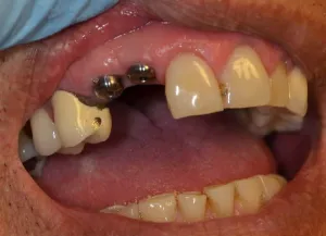 Patient MG Had an accident that damaged three of her front teeth. The crowns would not stay on and she even resorted to using crazy glue to try to stick them on. We placed two implants and restored their smile and confidence. As you can see she is really happy with the results and so am I. The picture on the right shows her flipper and the healing abutments. The picture on the left is of her fully restored case with the permanent crowns in place.