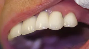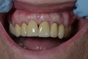 I am very happy with the cosmetic results. Her implant teeth blend so naturally with the other teeth, except for the red gingiva on #7 caused by an old poor fitting crown. The picture was taken at her one-week followup, the best I can do is a picture of her working cast on which the crowns were made since I did not have my camera on the day of cement.